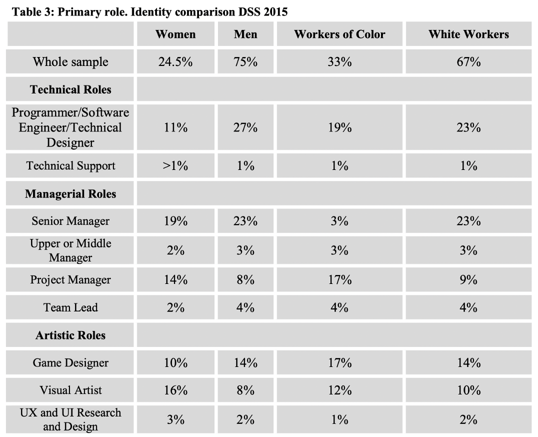 In the largest study (to date) of characters within video games Williams et al (2009) found that 82.9% of characters were white, 2.6% Latino, 11.4% Black and 2.6% Asian. The ethnic composition of the developer workforce at that time was 83.3% White, 7.5% Asian, 2.5% Hispanic, and 2% Black (Williams et al, 2009). When comparing the ratio of characters to developers both Williams et al (2009) and Gray (2012) highlight the importance of noting the prevalence, and often relegation, of black characters to sport focused games based on real life personalities rather than fleshed out characters with complex motivations and desires. A more recent report (igda, 2019) shows most developers identifying as White/Caucasian/European at 81% but 12% of this number also selected other ethnic categories, Hispanic/Latinx at 7%, Aboriginal/indigenous at 5%, East, South and South-East Asian at 10%, Black/African American/African/Afro-Caribbean and West-Asian at 2% (igda, 2019). When compared to the US census they found that, “the statistics for the DSS 2019 suggest a large overrepresentation of people identifying as white, and a slight overrepresentation of people identifying as Indigenous and as Asian.” (p.13, igda, 2019). This data outcome tracks with ideas that Williams et al (2009) put forward suggesting that there is a correlation between developers and the games they create rather than games accurately reflecting the population of the consumer market. In their 2015 report on primary roles and identities (see fig 1.) you can see the ratio of senior managers to ethnicity with 3% reporting as workers of colour and 23% reporting as white further highlighting the unbalanced relationship of positions of power and ‘race’ (Dreher, 2016). This issue can extend beyond developers to venture capitalists that are, “composed of ethnically homogenous teams” resulting in more diverse intellectual property (IP) being seen as “niche” or without a market (Peckham, 2020).